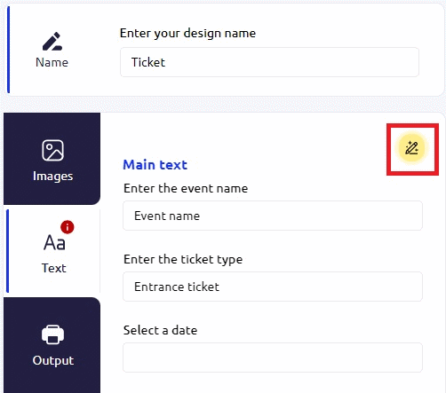 On the user site the AI Content Writer is enabled by clicking on the pulsating icon in the text tab of the design toolbar.
