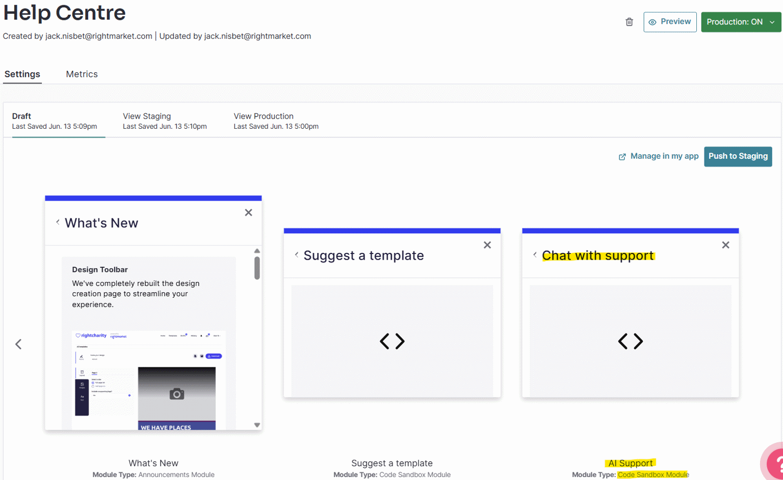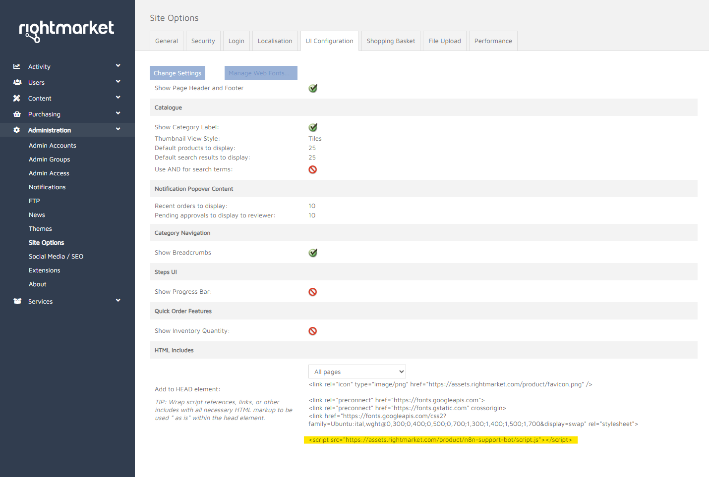 Enabling the AI Support Assistant requires a manual insert of an n8n snippet into the admin site options page.