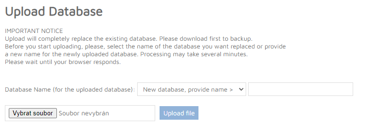 A database in CSV format can be uploaded in this section to update an existing database or to create a new one. Select the name of the database to update then click ‘choose file’ to select the data to upload. It is advisable to back up a database before uploading it. To add a new database, select New database > provide name from the dropdown and enter a name in the field on the right, then click choose file.