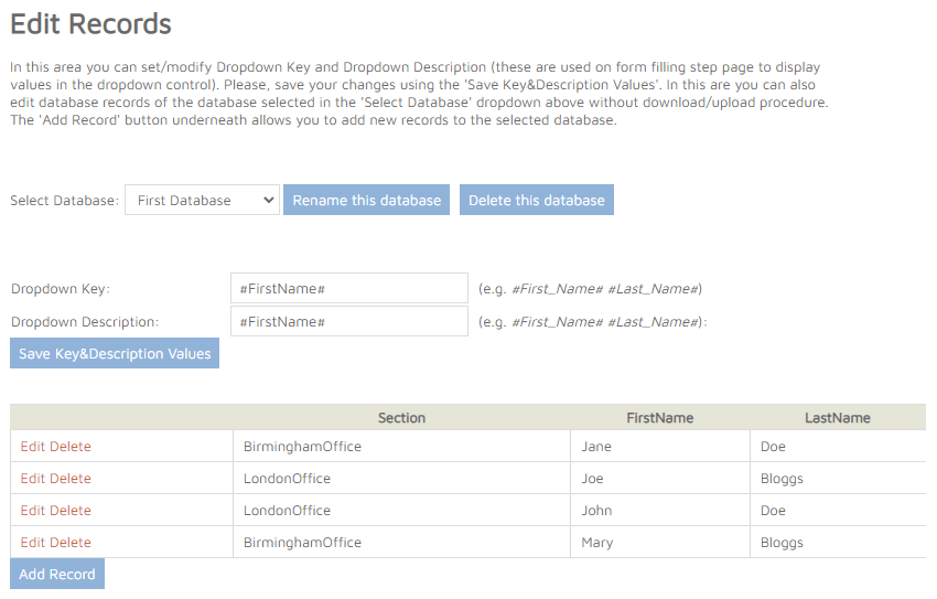 Once a database has been uploaded it will need a dropdown key and dropdown description which are then used on form filling page in the main dropdown. These two values are found in the ‘Edit Records’ section. Select the database from the dropdown list, both fields will be available to edit.