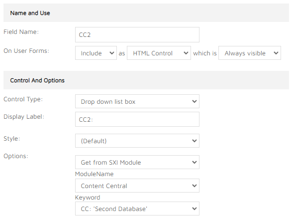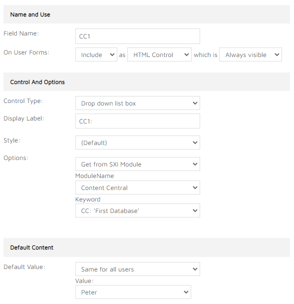 Each product enabled for Content Central can contain multiple record selection drop down controls. Each such control has to be created as ‘Drop down list box’ control type and it has to be configured to retrieve values from SXI Module. The ModuleName is ‘Content Central’ and the Keyword is the required Content Central database name (CC database configuration is explained here). The drop down control can be placed at any location among other form filling fields. Default values can also be configured - in that case the relevant form filling fields are populated on initial load of the document customisation user page.
