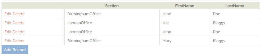 Individual records can be edited or deleted by selecting either of the two buttons on the left of the table. ‘Delete’ will remove this row and ‘Edit’ will make the contents of the row editable. Once edited click update for the changes to take effect. Add records by clicking the ‘Add Record’ button.