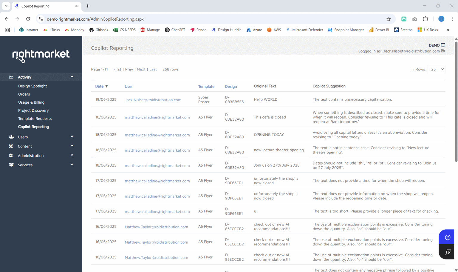 Administrators can view all Copilot suggestions they have received. The usernames are mailto links to make it easy for them to get in touch with users regarding any input. The column headers can be sorted, to make it easy to find certain kinds of suggestions.