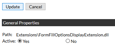 Copy the FormFillOptionsDisplayExtension.dll file to the webpages\bin\extensions folder of the deployment required. Note: This will cause any currently running sessions to be reset.