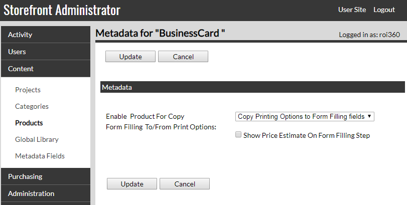 To allow and specify the direction of the copy of the fields, please click the Products in the left-hand menu. Then select a Product. On the configuration page, scroll down and click the Metadata link. Look for a drop-down box as shown on the picture: