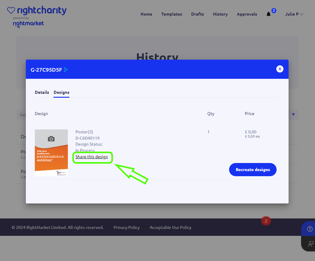 The History page displays an overview of all ordered or downloaded designs. The detail box contains a share/unshare link depending on the shared status of the design. The current user can click and share their design with other users. The link is then switched to unshare so the user can change their mind. Shared Designs based on Staged Templates can only be unshared.