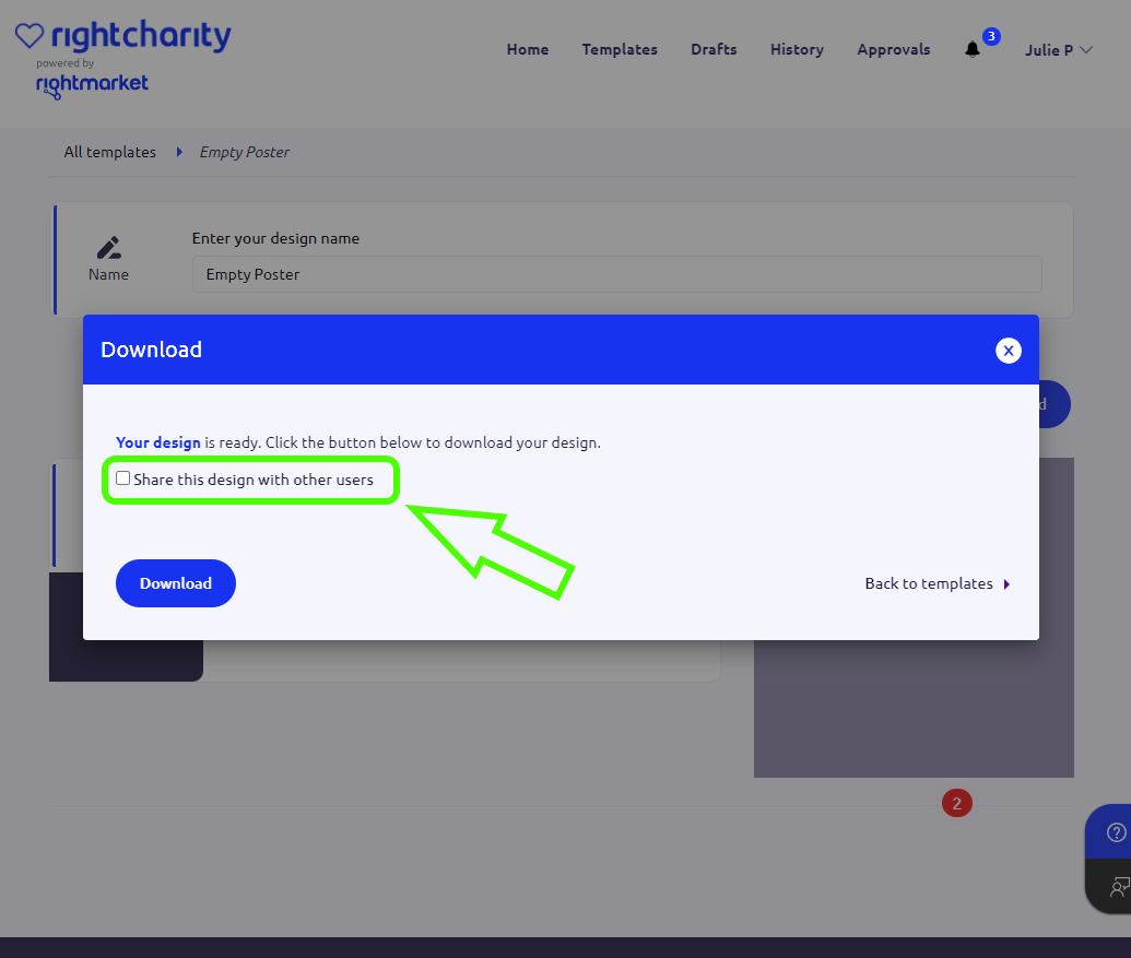 If the finished design is delivered to the user by the instant download method then a checkbox is added in the Download box. Unlike on the History page, the user can only share the design by ticking the box before they click the Download button. After that, if the user have changed their mind, they need to look the design up on the History page and unshare it from there. Attempts to share Designs based on staged Templates are blocked. In such a case the Download box checkbox is disabled, the History page contains a strike-through text, not an active link. In both cases, when moving the mouse cursor over the text, the browser shows a hint telling about the staged templates.