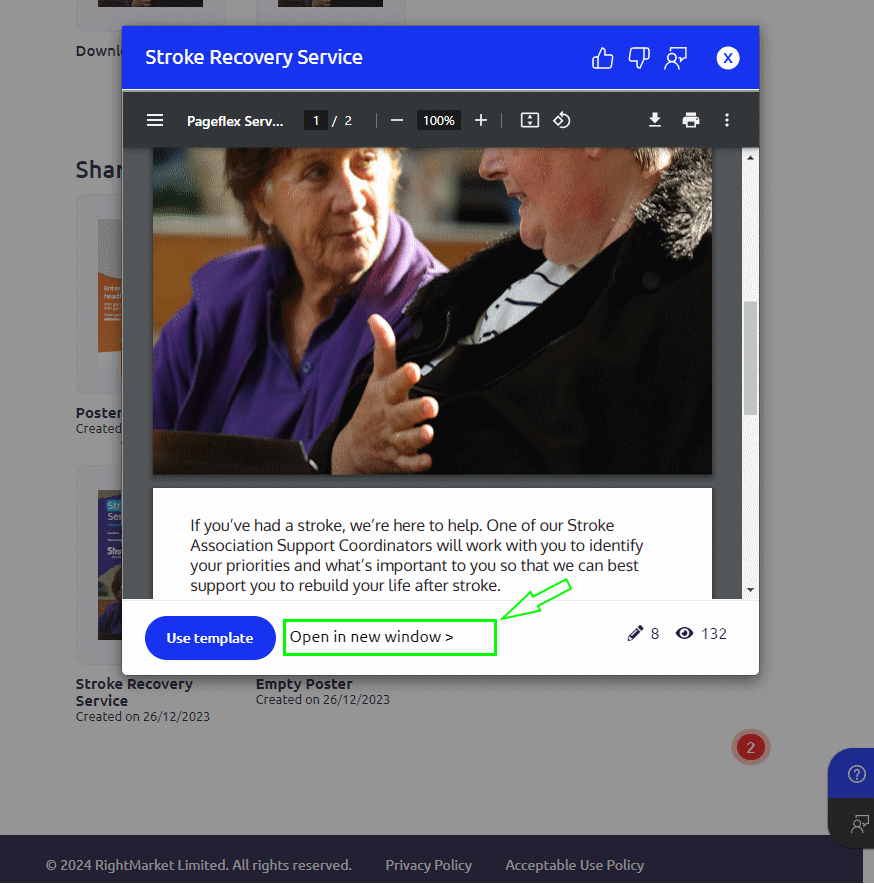 Clicking the Open in new window link shows the design in its own browser window so the user who’s interested in the design can observe it in the tiny detail before they decide to use it as a template and create their own similar design.