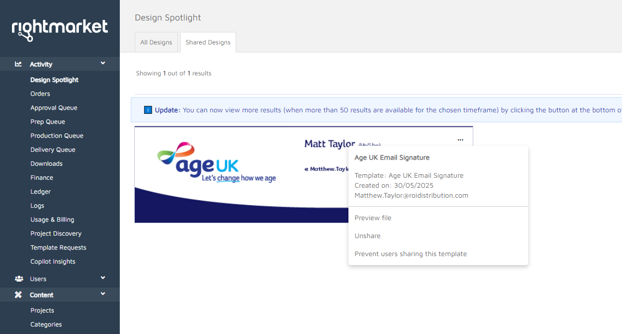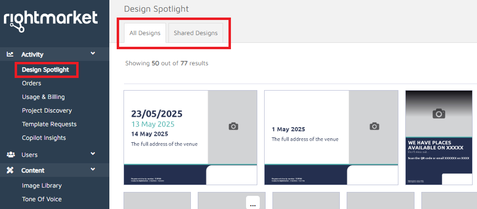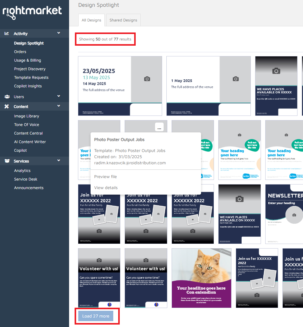 The extension adds the Design Spotlight menu item to the left-hand main menu. Selecting the link displays the overview split to two sections “All Designs” and “Shared Designs”. The filtering controls on the right hand side allow the user to filter for specific dates. In both sections the ‘Load more’ functionality can be used to show additional items.