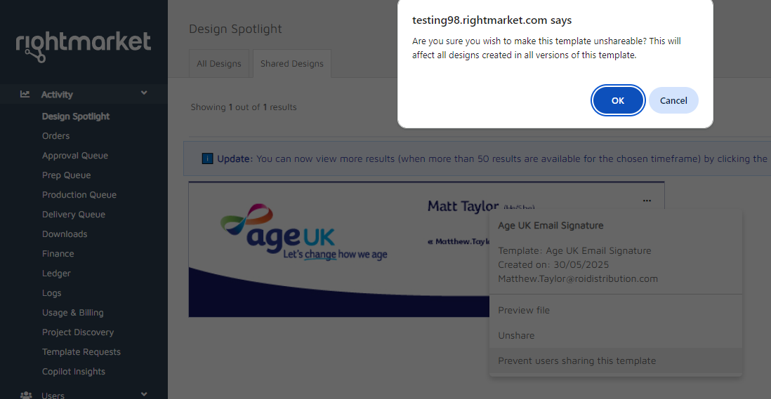For “Shared Designs” it also allows to preview the file. The “Unshare” option unshares the item and the item is removed from the view. By default, the “Shared Designs” shows the last year of results, compared to the last month in “All Designs”. The last menu option allows admins to prevent sharing this template. It uses the product meta field described on the Setting Up page and affects all versions of the template.
