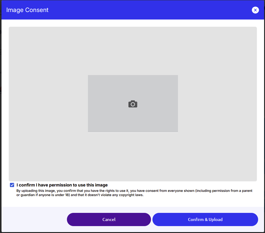 The Confirm and Upload button is enabled only if the user selects the I confirm… option. The Image Field settings can enforce a certain image size. If it is not matched, the Confirm button won’t be enabled. Please see the Setting Up chapter to be aware of the Image Field configuration.