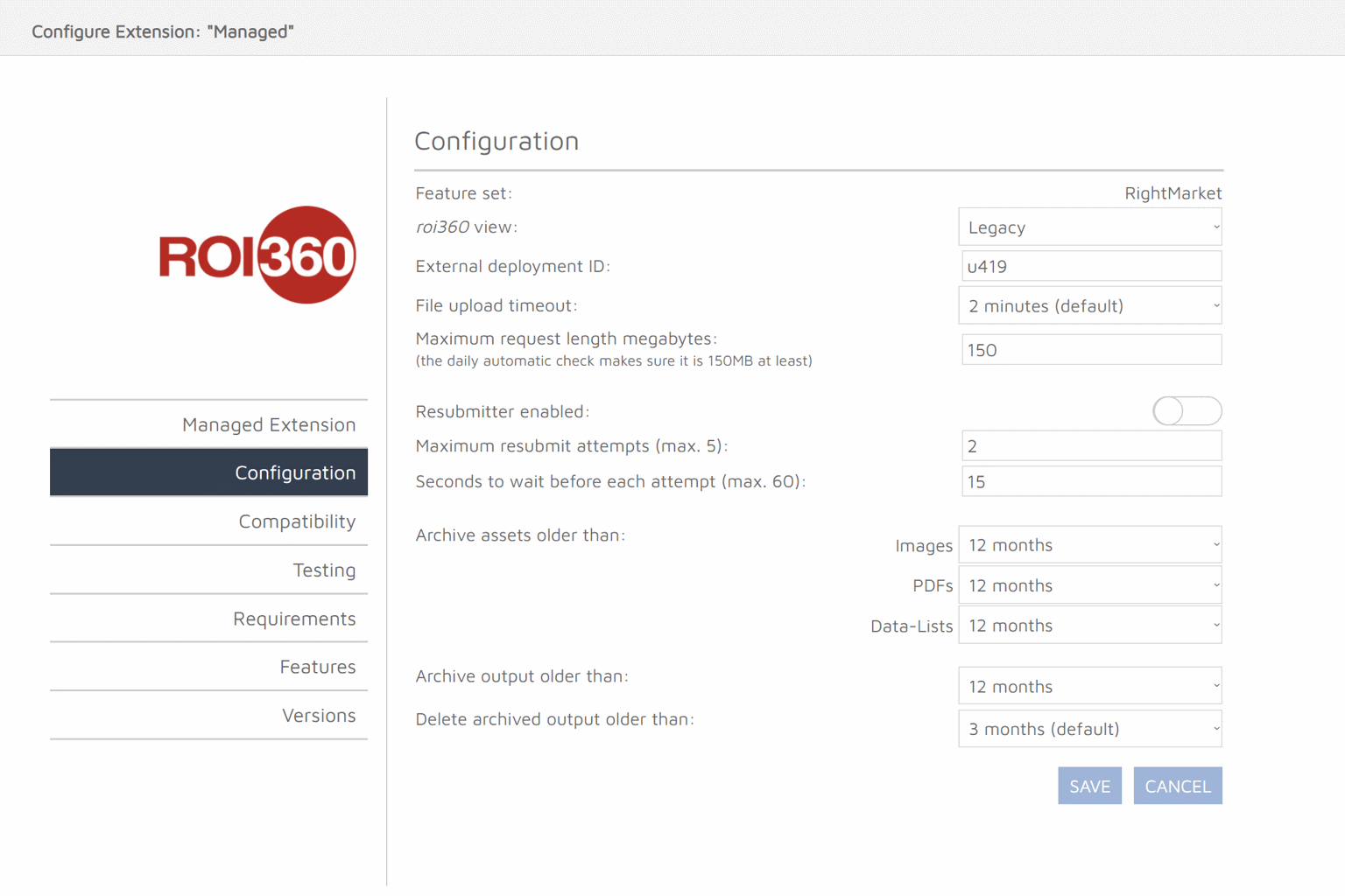 Feature set - Shows which feature set is in use, this will either be ROI360 or RightMarket. This is controlled via the customer options on https://manage.rightmarket.com\\ roi360 view - This option changes the view that the roi360 & rightmarket user see’s. This can be changed from: