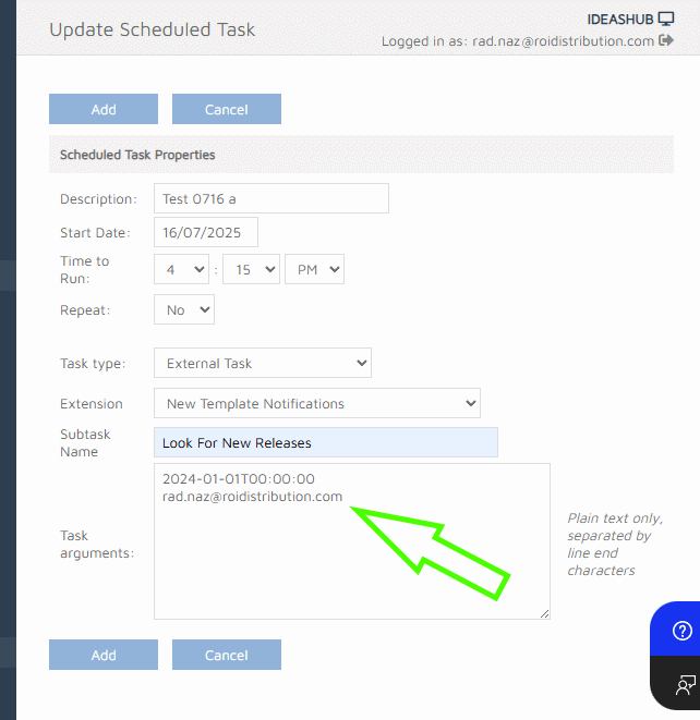 If the task is run with the arguments as above, it is considered a testing task, no matter if the Test Mode is on or off. With the Test Mode off, it is the only way to test the actual email delivery without launching an avalanche of user emails. Two lines must be entered in the Task Arguments text-box: