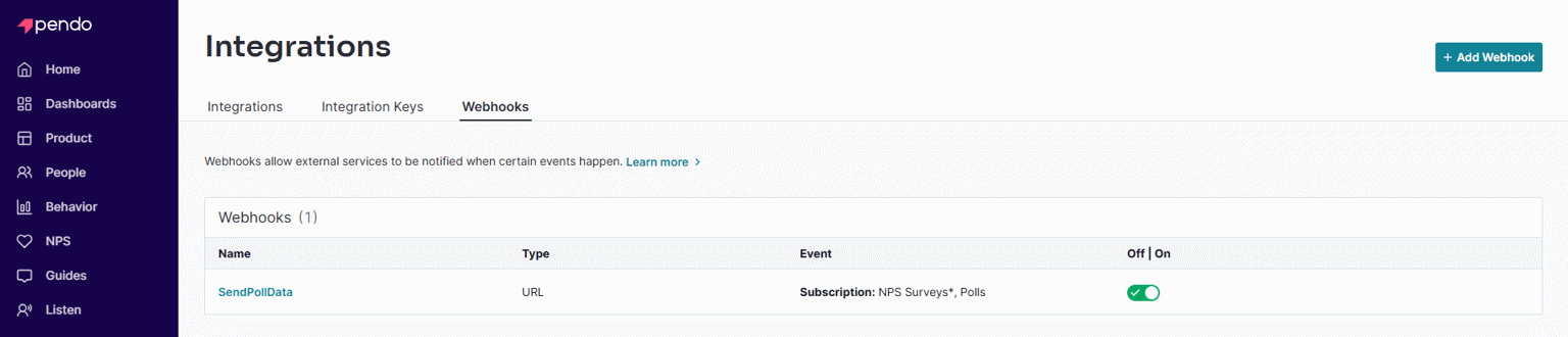 | EnableSignatureValidation | Determines whether webhook requests will undergo signature validation, using HMAC-SHA256 to verify authenticity of the request from Pendo. Set to false for testing (e.g., with tools like Postman). For security in production, set this to true to ensure request integrity. When testing in Postman, we recommend setting EnableSignatureValidation to false. |