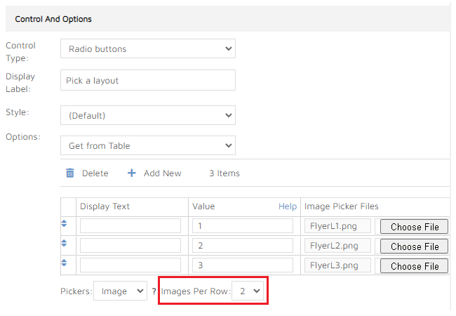 In the Image Pickers mode another drop down is displayed under the values table - ‘Images Per Row’. The value selected in this drop down determines how many images will be displayed side by side each row when the image picker is shown in the design toolbar.