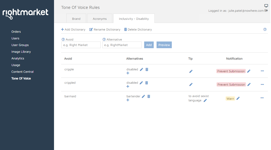Clicking the row options icon … on the right and then selecting Preview brings up a dialog where an admin can enter text to preview how the Tone of Voice assistant will respond. The text is checked on every key-stroke and warnings are shown just like on the User Site when editing design text-fields.